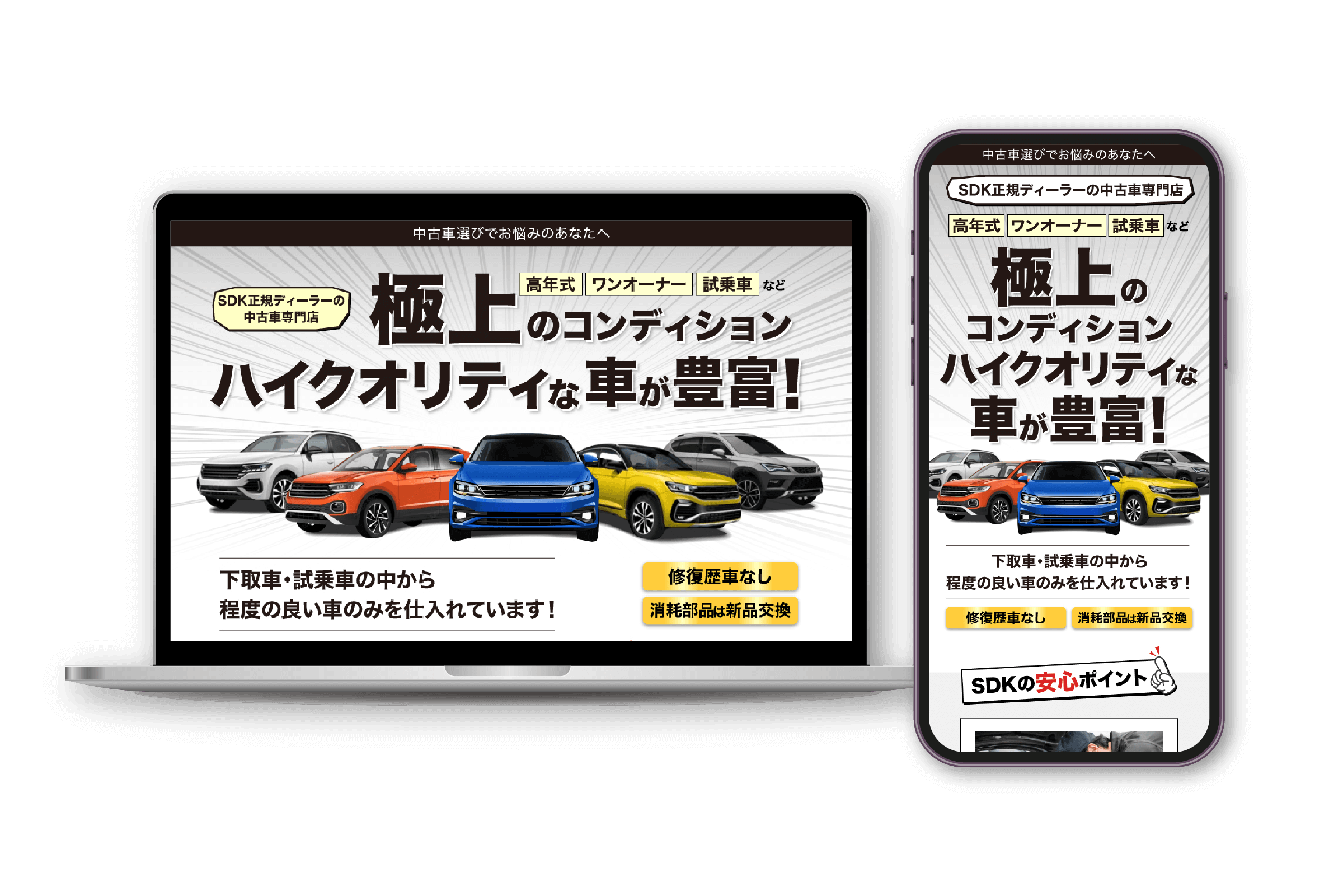 極上でハイクオリティと豊富な品揃えの中古車販売を表すのに、メインカラーにはシルバーに近いグレーを採用。
