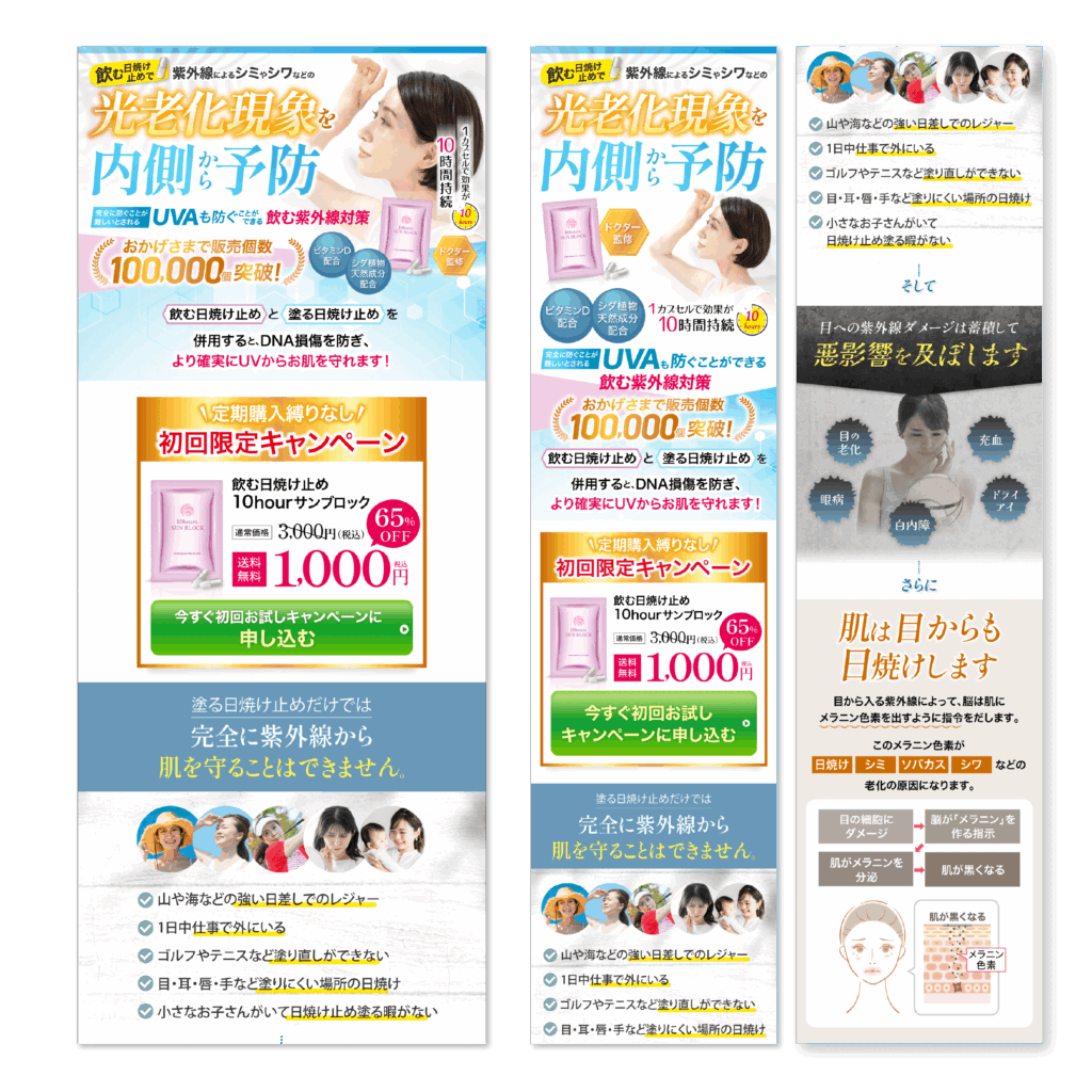 LP 飲む日焼け止め 2025 12/30 LP 2025年12月30日 制作について 日焼け止めLPのデザインをしました。 担当範囲 ・構成設計・デザイン:Illustrator, Photoshop・納期:約10日間 LP 関連実績 LP ファイナンシャルプランナー向け商品 LP 寝具 枕 LP パーソナルジム LP シャンプー LP 子供用成長サプリメント LP 中古車 LP ウクレレ教室 LP WEB集客講座 オプトLP