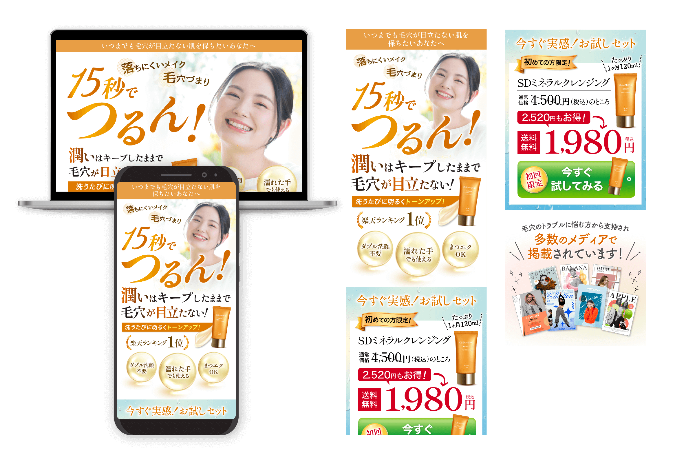 15秒で落ちること、つるんとした肌になることを擬音を使い強調することで、アイキャッチを立たせ商品の差別化を計りました。