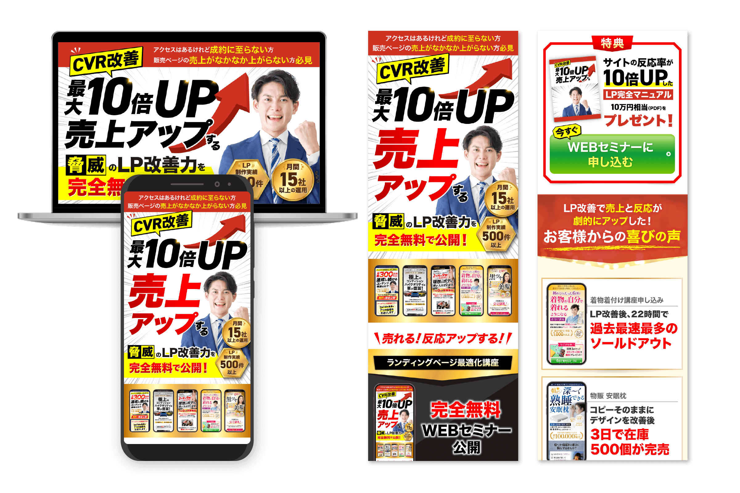 この講座を受講するとLPの売上が格段にアップすることを、矢印が上に伸びるイラストや男性のガッツポーズ等で効果のある力強さを全面に押し出しました。