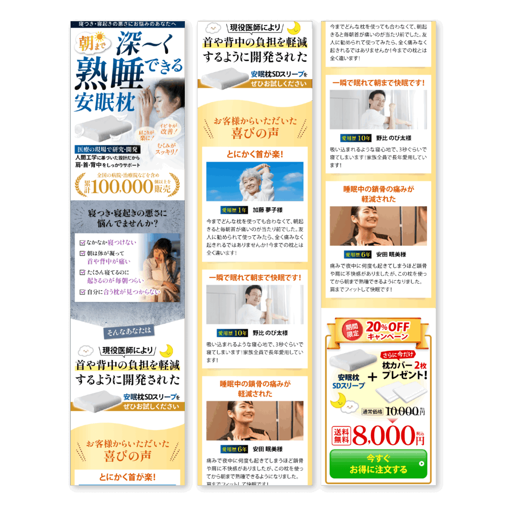 深刻な不眠に困っている方は様々な商品を試されているので、枕という商品名よりも「朝まで深く熟睡できる」というキャッチコピーをたたせたファーストビューにいたしました。